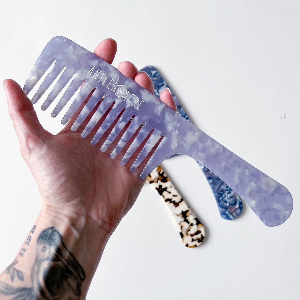 Introducing new Antler & Acre shower combs! These combs are made of cellulose acetate which is stronger and more environmentally friendly than traditional plastics. Your hair is most fragile when it is wet and using a brush to detangle can unnecessarily pull out more hair. These wide tooth combs are designed to easily glide through wet hair and minimize breakage. They are not only useful on wet hair though! They are very lightweight and can be thrown in your purse or left in your car for anytime your hair needs a refresh throughout the day. Great for the beach too!